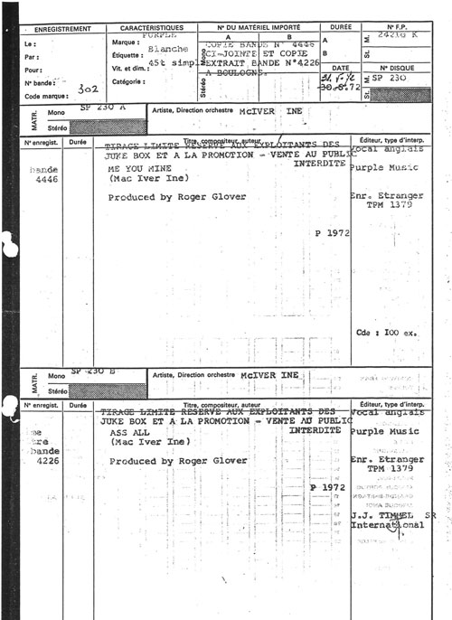 France, 1972 - 7" - EMI SP 230 - Promo pressing - misspelt 'McIver Ine' on labels<br /> 100 copies pressed only in May 1972<br /> matrices: SP 230 A 21 M3 286578 / SP 230 B 21 M3 286579